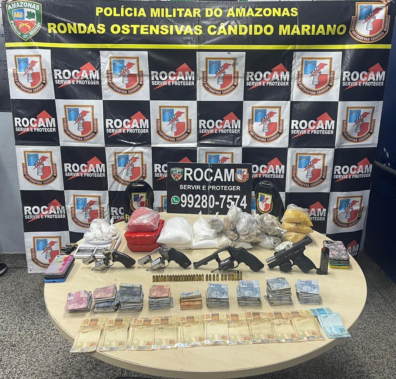 No local foram apreendidos três revólveres calibre 38, uma pistola 380, e 30 munições. Foram localizados, ainda, três tabletes de oxi, quatro de cocaína, três de maconha, oito pacotes de oxi, dois cigarros de maconha, balanças de precisão, um relógio e R$2,3 mil em dinheiro.