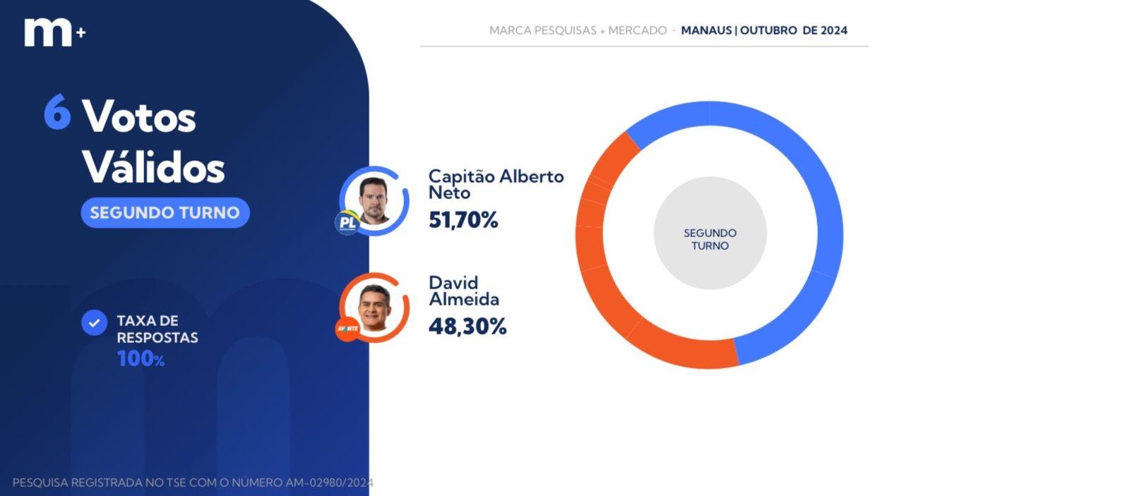 Candidato do PL a prefeito de Manaus–AM, Capitão Alberto Neto lidera o primeiro levantamento do instituto Marca Pesquisas do segundo turno da eleição no município contra o atual prefeito, David Almeida (Avante).