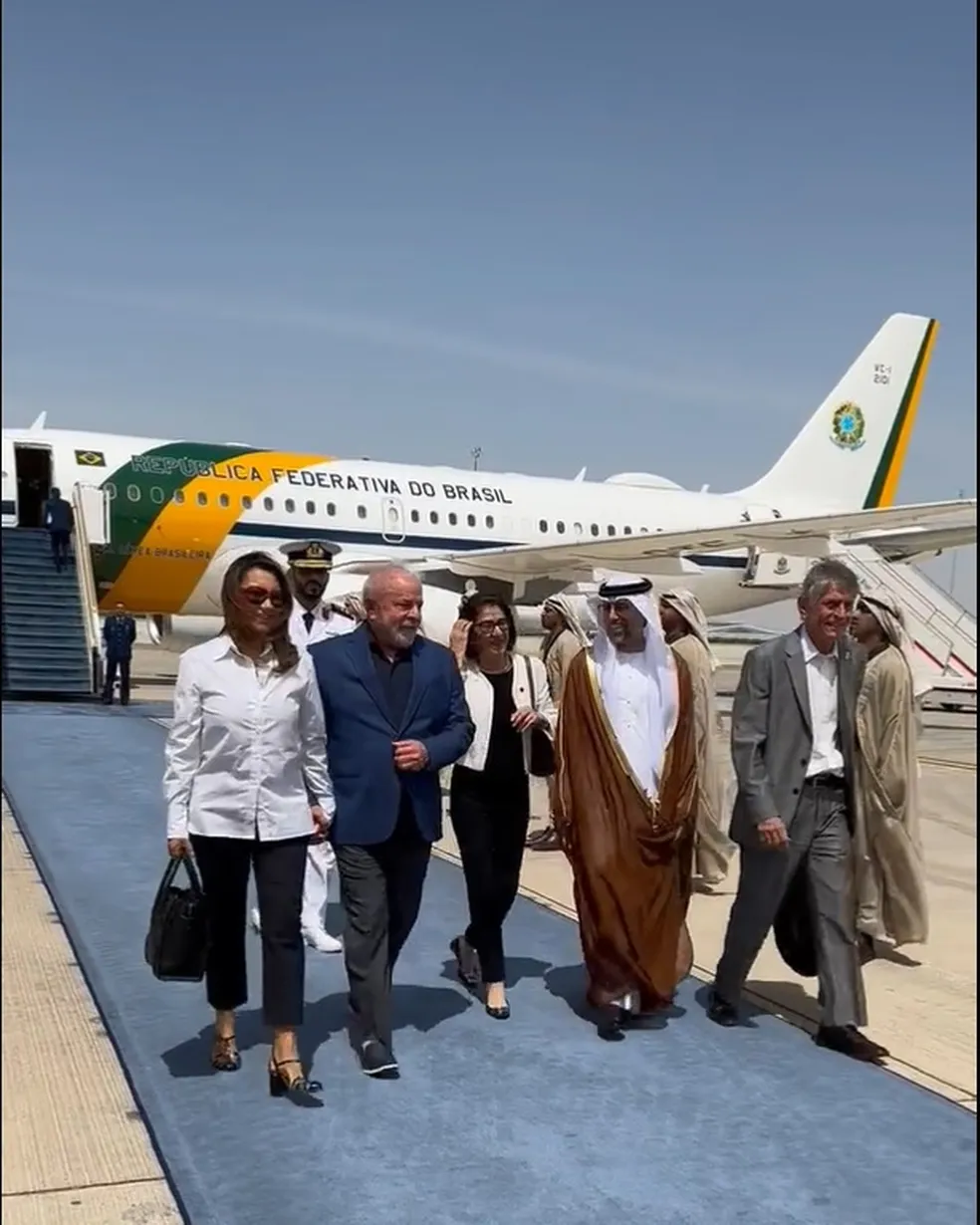 Lula chegou a Abu Dhabi por volta das 7h (horário de Brasília) após dois dias de agenda em uma viagem oficial à China, onde se encontrou com o presidente chinês, Xi Jinping, entre outras autoridades.