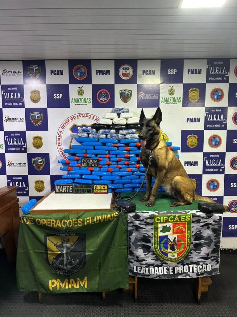 Policiais militares, em operação na Base Fluvial Arpão, apreenderam, na noite desta quinta-feira (26/10), mais de 100 quilos de cocaína e pasta-base de cocaína, no município de Coari (a 363 quilômetros de Manaus). As drogas estavam escondidas dentro da boia de uma embarcação, sendo encontrado com a ajuda da cadela policial Havana.