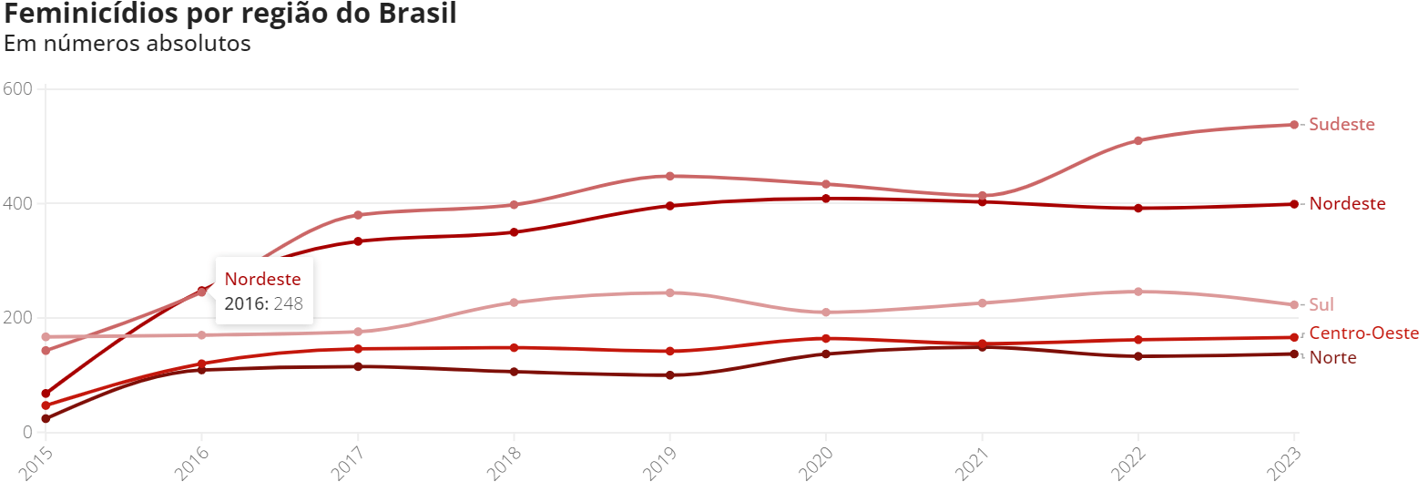 Apesar de ser a menor quantidade de casos se comparado com todo o Brasil, a região sudeste apresentou o maior crescimento de feminicídios em um ano, passando de 512 vítimas em 2022 para 538 em 2023.