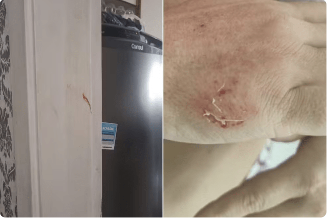 “Ela já foi me empurrando para dentro do meu apartamento me socando e puxando o meu cabelo. Ela me arranhou, mordeu a minha mão, tem até sangue na parede. Ela chegou a entrar na cozinha, mas sorte que não tinha faca na mesa”, afirmou ela.