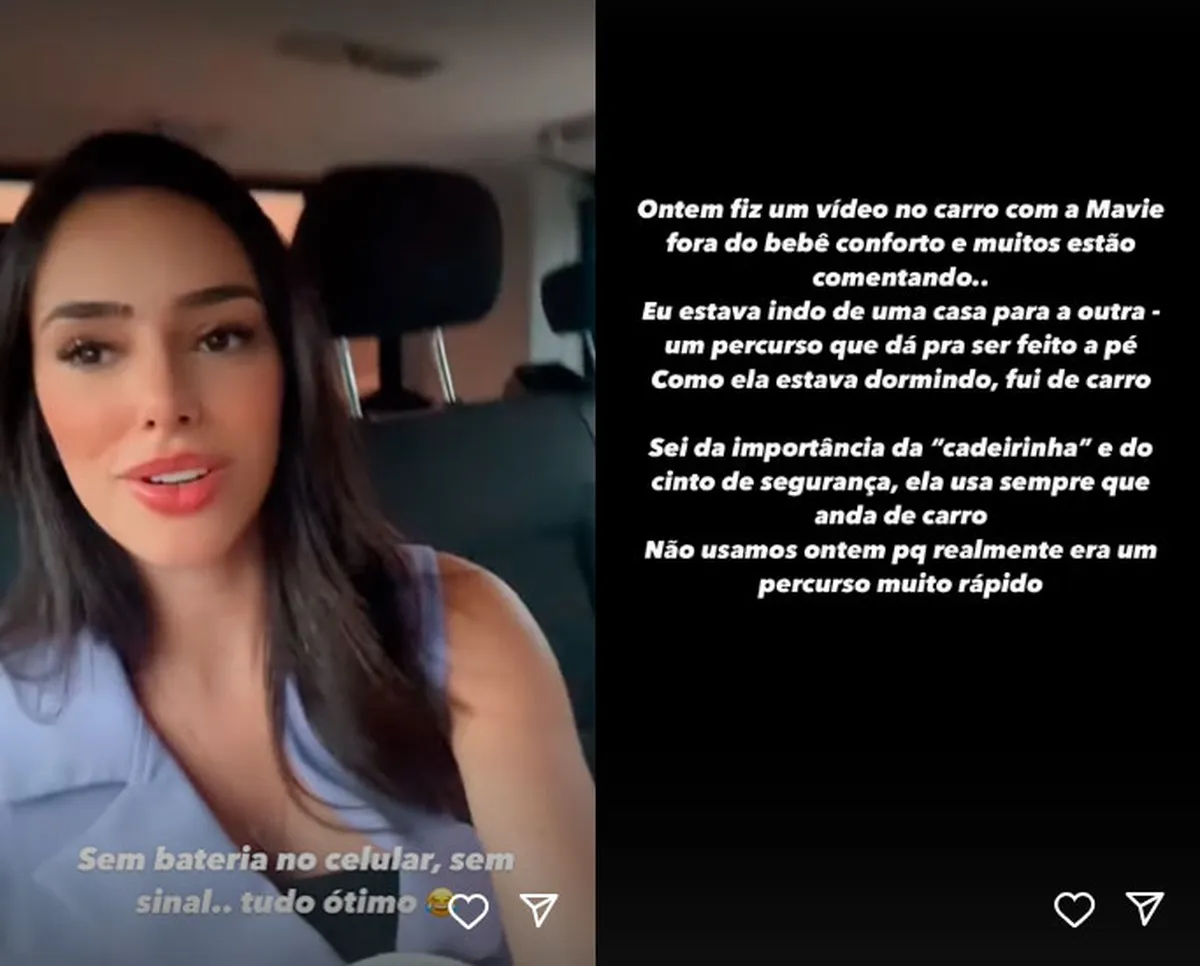 Bruna reforçou a importância do uso da “cadeirinha” e do cinto de segurança. “Ela [a Mavie] usa sempre, não usou ontem porque era um percurso muito rápido”, completou.