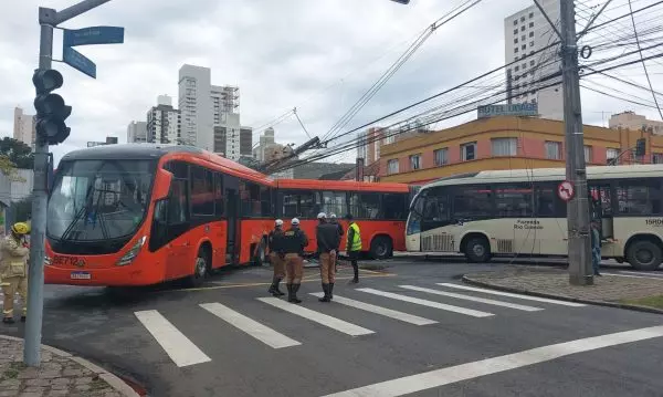 A batida foi tão forte, que o biarticulado de Curitiba foi arrastado alguns metros e bateu num poste, que se despedaçou e foi parar embaixo do ônibus.