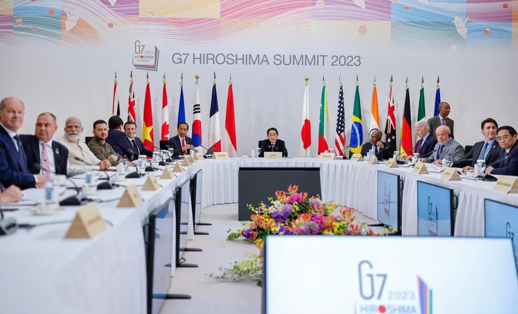 Na mesa durante a sessão com os demais países, o brasileiro ficou entre o presidente americano Joe Biden e o premiê canadense Justin Trudeau. Bem em frente a ele estava o ucraniano, ladeado pelo indiano Narendra Modi e o sul-coreado Yoon Suk-yeol. Ao centro, estava o anfitrião do encontro, o japonês Fumio Kishida.
