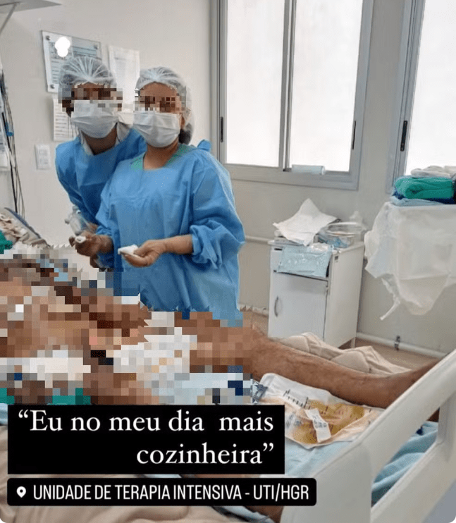 A imagem foi postada nos stories da enfermeira, alguém fez o print e a imagem passou a circular nas redes sociais. O registro mostrava um paciente deitado no leito, com ferimentos expostos nos braços e perna, próximo à virilha.