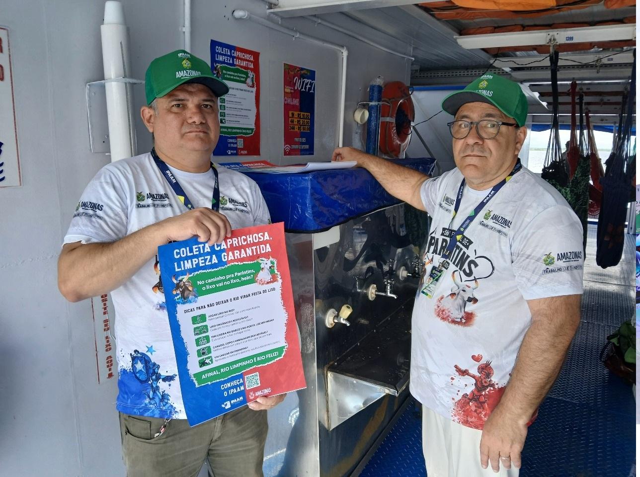 Além do público em geral, técnicos do Instituto também estão realizando abordagens com tripulantes e responsáveis pelas embarcações que fazem o trajeto Manaus–Parintins. A equipe orienta sobre o descarte correto dos resíduos e realiza a afixação dos cartazes da campanha nas embarcações.