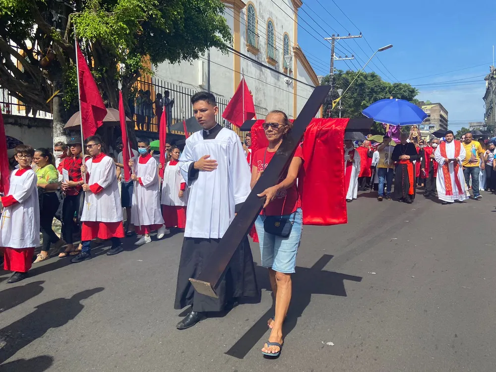Fieis que participaram da Via Sacra em Manaus, nesta Sexta-Feira da Paixão (7), se revezaram para carregar a cruz, símbolo da crucificação de Jesus. A procissão, que começou na Igreja da Matriz e terminou no Santuário de Fátima, percorreu ruas da Zona Sul de capital.