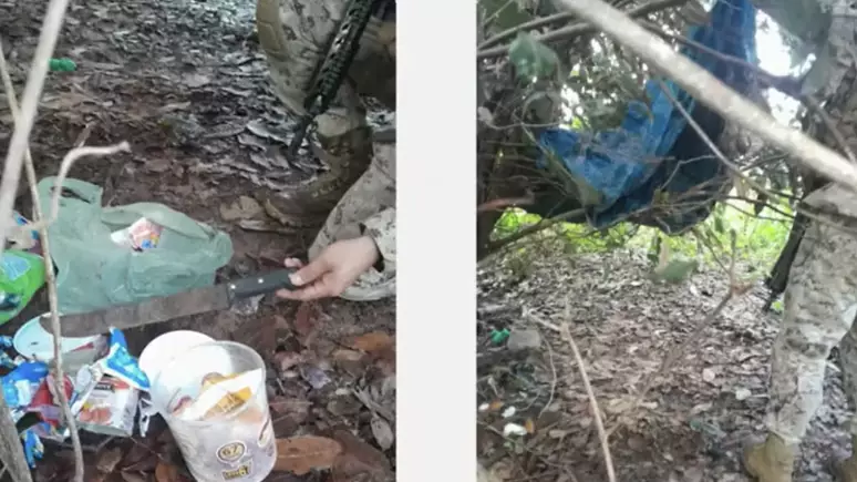 A força-tarefa localizou um facão, uma lona e alimentos (imagem em destaque), em uma região de difícil acesso. Como mostrou a coluna Na Mira, o governo oferece R$ 15 mil por informações de fugitivos.