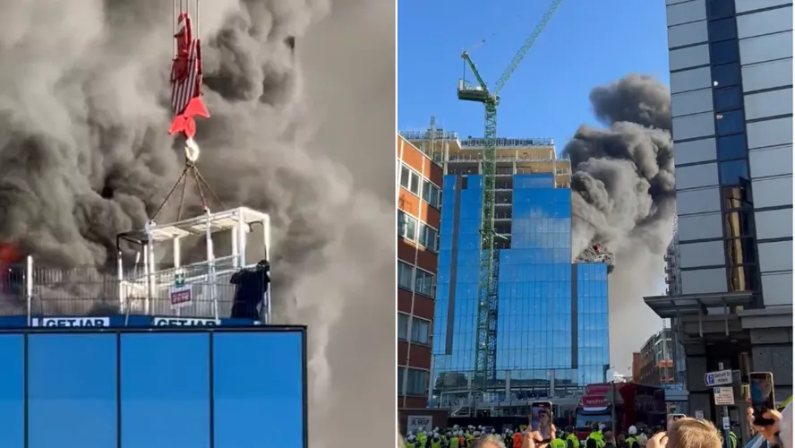O vídeo da cena, que viralizou nas redes sociais, mostrou um homem sendo resgatado por uma gaiola de guindaste do telhado de um prédio em construção, enquanto espessas nuvens de fumaça escura e chamas ondulavam ao seu redor.