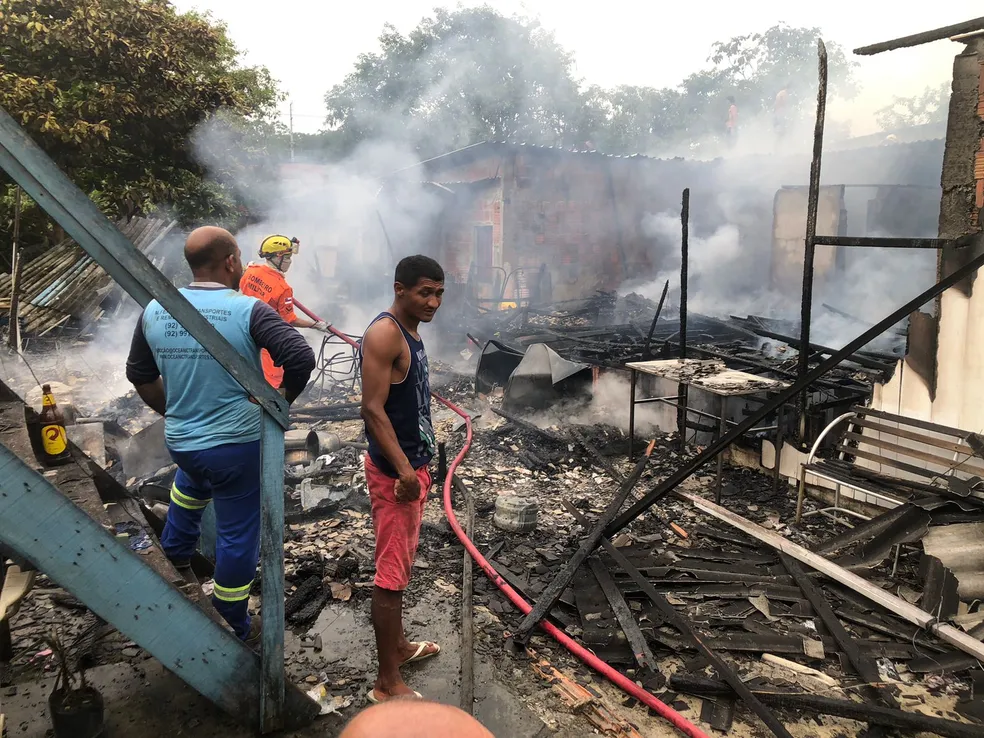 Um incêndio destruiu duas casa e deixou outra parcialmente queimada no Distrito Industrial, Zona Sul de Manaus, nesta terça-feira (7). Dez pessoas moravam nos locais e ficaram desabrigadas.