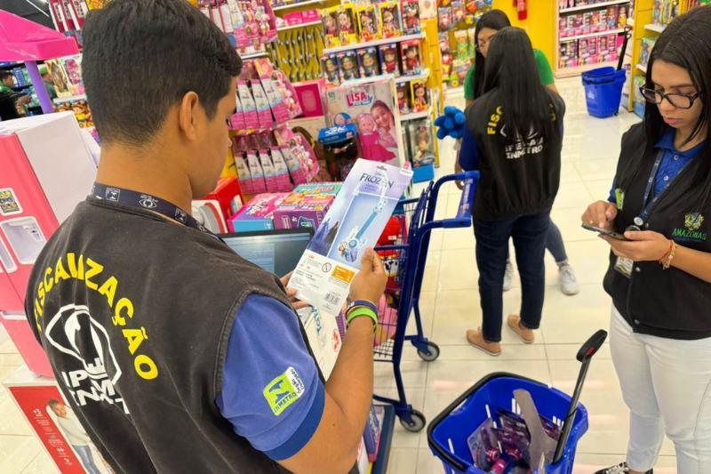 Agentes do Ipem-AM (Instituto de Pesos e Medidas do Amazonas) apreenderam, nesta terça-feira (23), diversos brinquedos em uma loja de departamento na Avenida Governador José Lindoso, bairro Parque Dez, zona centro-sul de Manaus.