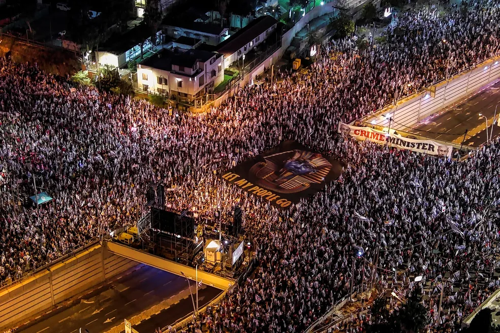Dezenas de milhares de israelenses participaram de protestos neste sábado (8) contra os planos do primeiro-ministro Benjamin Netanyahu para aumentar o controle que governo exerce sobre a Suprema Corte do país.