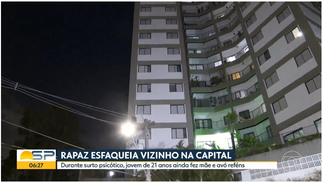 Um jovem de 21 anos teve um surto psicótico na noite desta quinta-feira (2), quando esfaqueou um vizinho na cabeça e na costela e atacou outro com spray de gás no rosto, após uma discussão. Além disso, o rapaz fez a mãe e a avó reféns dentro do apartamento onde morava com a família, na Zona Norte de São Paulo.