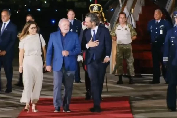 O presidente desceu da aeronave ao lado da primeira-dama, Janja da Silva, e foi recebido com honras militares e um tapete vermelho. Lula foi recebido pelo ministro das Relações Exteriores da Argentina, Santiago Cafiero.