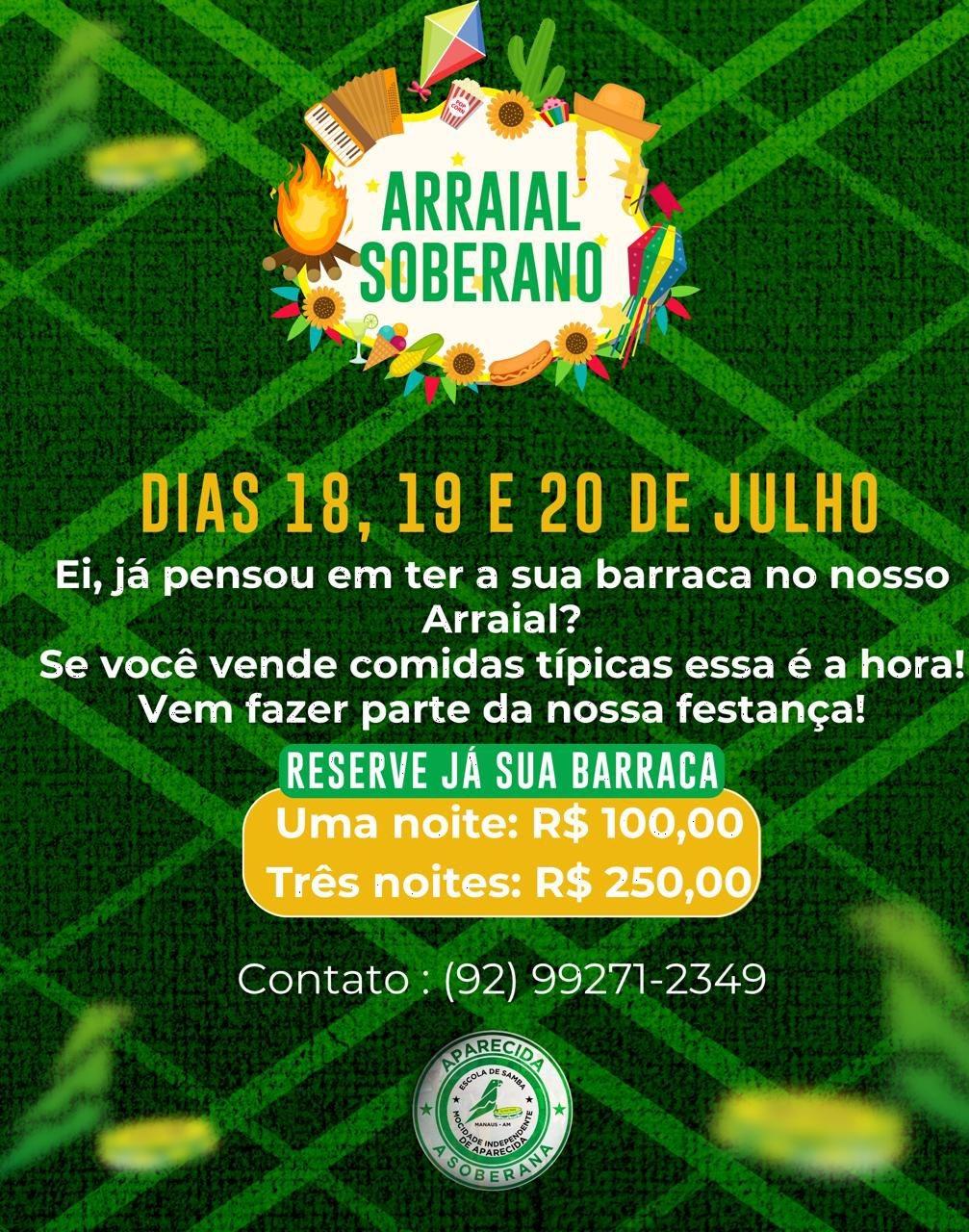 Vem coisa boa por aí. Já imaginou três dias de festa. Arraial, com barracas com guloseimas, comidas típicas regionais, danças folclóricas e você podendo acompanhar mais de 20 danças folclóricas, em uma mesa, sentado com amigos ou família, ou ver tudo de camarote e com segurança? Pois é, no final de semana que vem, dias 18, 19 e 20 de julho, o GRES Mocidade Independente de Aparecida realiza o seu Arraial Soberano, na quadra da Escola de Samba, bairro de Aparecida, zona Sul de Manaus.