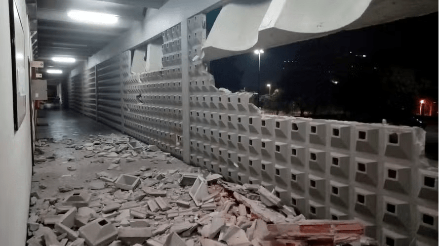 As imagens mostram um buraco no que seria o muro. Tijolos despedaçados ficaram espalhados pelo corredor do prédio. Os destroços impossibilitaram a passagem.