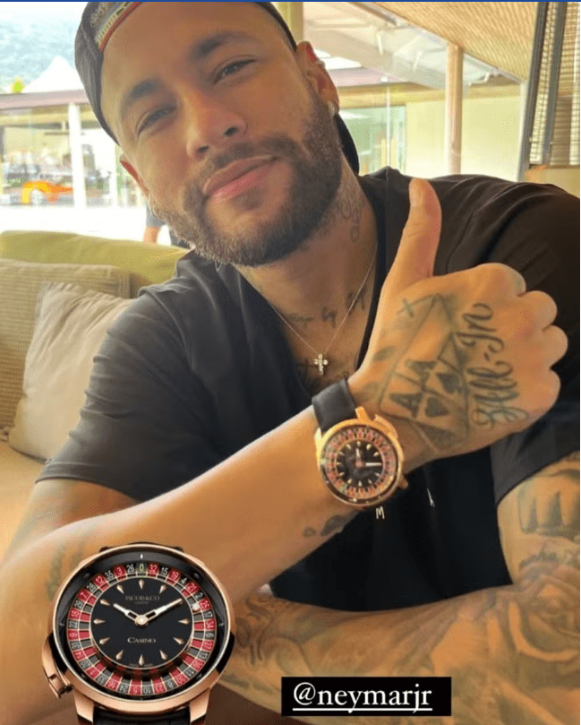 Ainda sem poder entrar nos gramados por conta de uma lesão sofrida em outubro do ano passado, o atacante Neymar surgiu nas redes sociais exibindo um de seus bens caríssimos. O jogador do Al-Hilal, da Arábia Saudita, apareceu usando um relógio Jacob & Co. Casino Tourbillon com roleta integrada, avaliado em cerca de 280 mil dólares (cerca de R$ 1,3 milhão, na cotação atual).