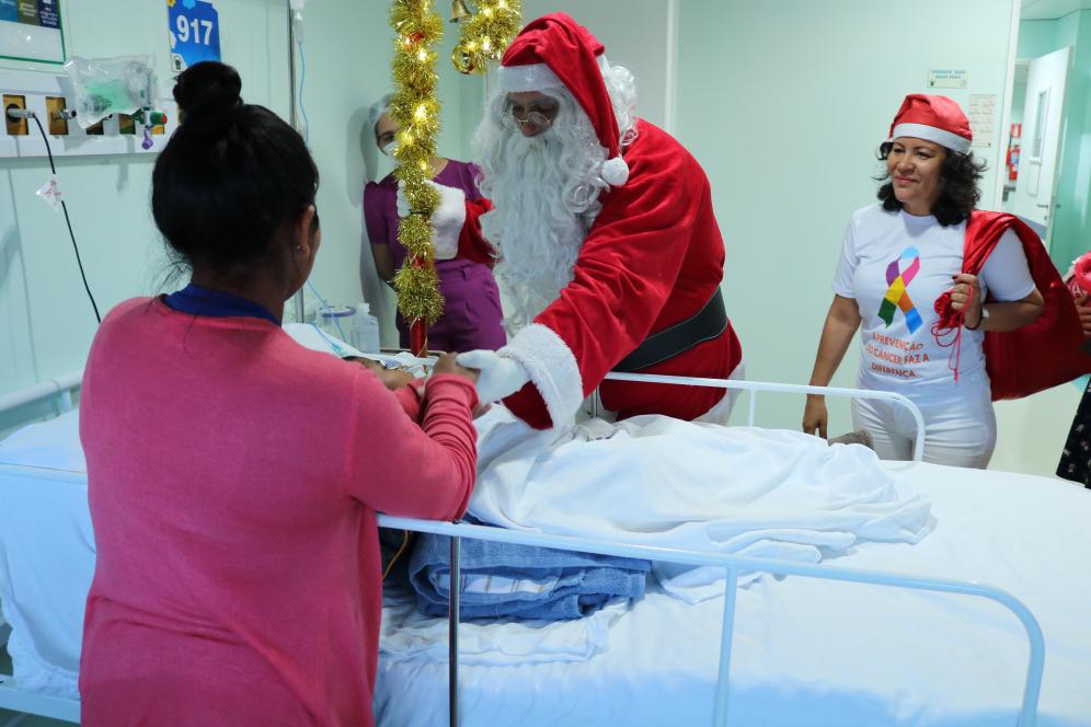 Segundo a Coordenadora Estadual de Atenção Oncológica, Marília Muniz, a ação contou com a presença de dois Papais Noéis, que se revezaram na entrega dos presentes e kits de higiene e limpeza aos pacientes. Ela explicou que eles percorreram todo o hospital, como por exemplo, os serviços de Ambulatório, Serviço Social, Imagenologia, Quimioterapia, Radioterapia, Urgência e Emergência, dentre outros.
