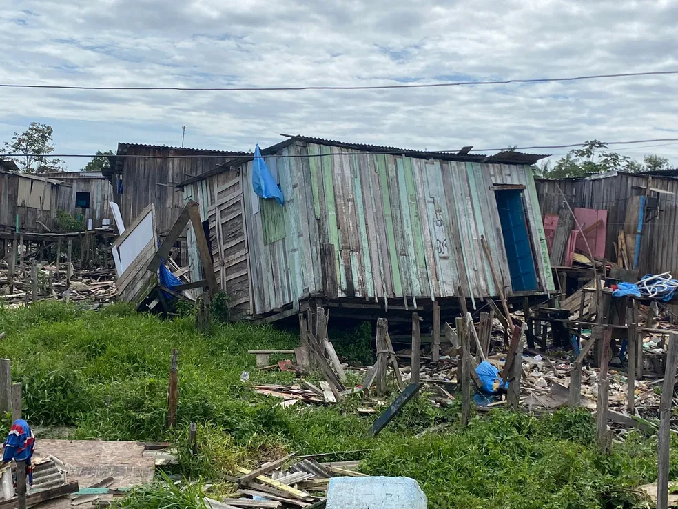 Uma palafita desabou parcialmente em uma área alagada, situada na comunidade da Sharp, bairro Armando Mendes, Zona Leste de Manaus, no fim da noite de domingo (22). A família que morava na casa dormia no momento do tombamento.