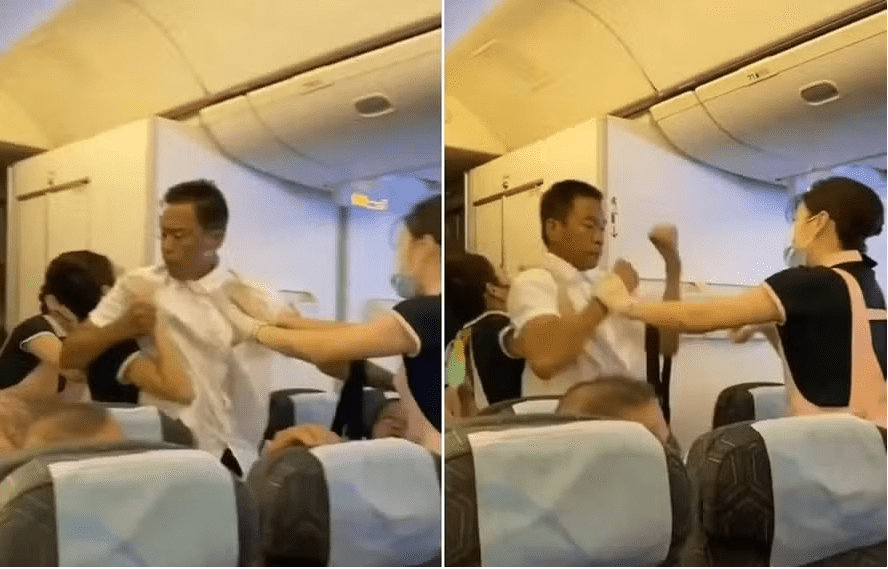 Os passageiros podem ser ouvidos gritando enquanto os dois homens brigam, trocando golpes no corredor antes que vários passageiros se apresentem para ajudar a tripulação a separá-los.