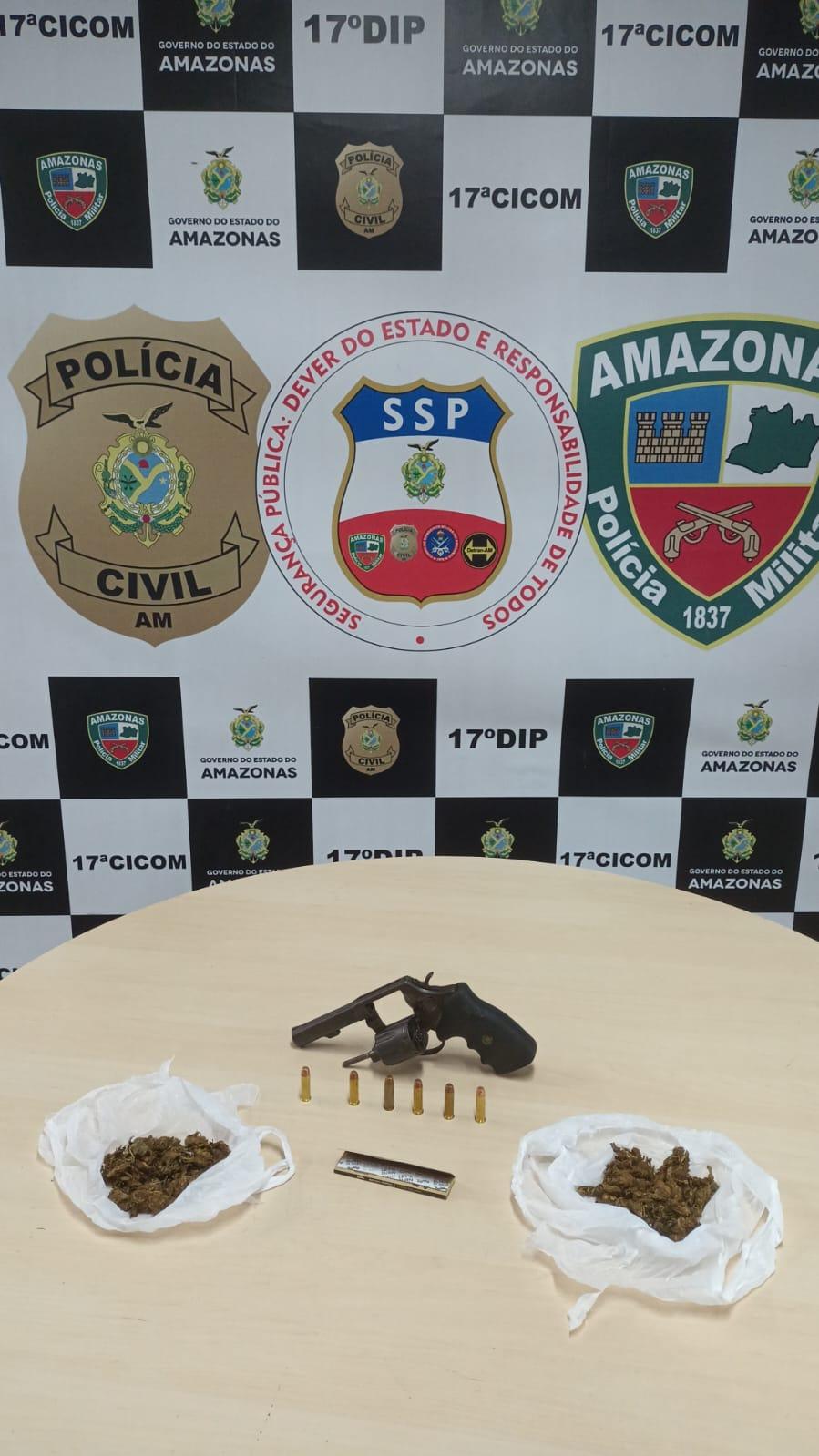 Ainda conforme o titular, durante buscas nas residências, foram encontrados uma arma de fogo com numeração raspada, calibre 38 e sem marca legível, contendo seis munições, e dois pacotes de substância análoga a maconha.