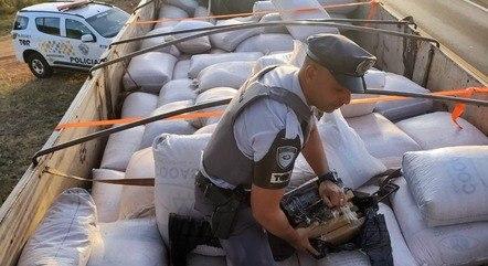 A carga de droga era transportada escondida sob sacas de milho. A apreensão aconteceu após uma patrulha policial na região.