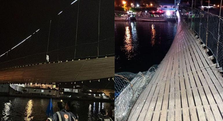 A ponte Pênsil, na cidade de Torres, que fica entre Santa Catarina e Rio Grande do Sul, cedeu parcialmente no momento em que 100 pessoas estavam em cima da estrutura, na madrugada desta segunda-feira (20).