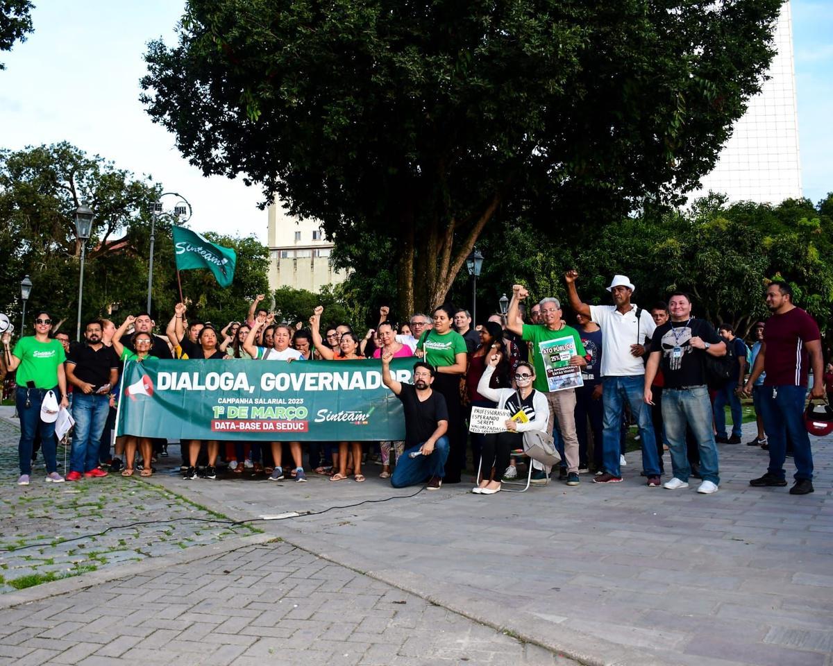 Professores realizaram hoje (30) um ato organizado pelo Sindicato dos Trabalhadores em Educação do Estado do Amazonas (Sinteam) cobrando que o Governo do Amazonas pague a data-base dos anos 2022 e 2023, o reajuste da defasagem salarial na ordem de 25% e os retroativos dos anos 2020 e 2021.