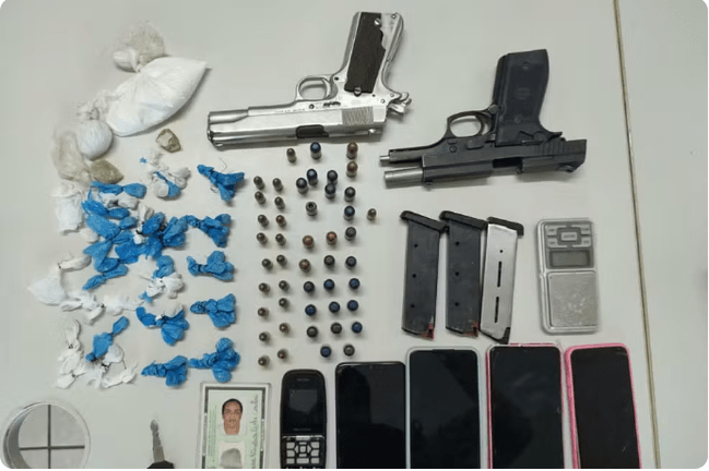 Logo em seguida, a polícia entrou na casa e encontrou drogas, munições, balança de precisão, telefones e até uma motocicleta com restrição de roubo. Na delegacia, foi constatado que o grupo também era responsável por fazer arrastões na cidade.