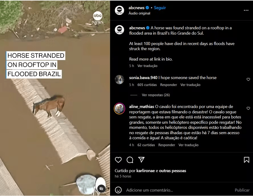 O site da BBC News também noticiou. “Esforços de resgate estão em andamento no estado do Rio Grande do Sul, no Brasil, depois que enchentes e deslizamentos de terra mataram pelo menos 100 pessoas. Mais de 160 mil pessoas foram deslocadas pelas cheias, tendo alguns municípios sido completamente destruídos pelas águas das cheias. Surgiram fotos na quarta-feira de um cavalo preso em um telhado em meio às enchentes na cidade de Canoas. O prefeito da cidade disse à GloboNews que esperavam resgatar o cavalo com a ajuda de um helicóptero”.