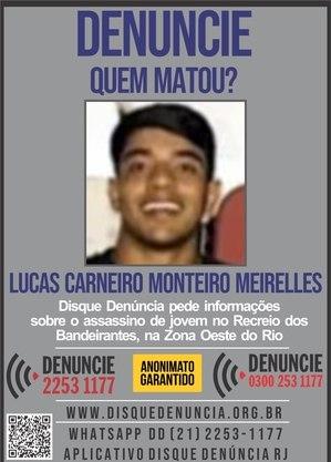 O Disque Denúncia divulgou um cartaz para pedir informações da população para identificar o homem que matou o estudante de odontologia Lucas Carneiro Monteiro Meireles, de 27 anos, durante um assalto no Recreio, na zona oeste do Rio de Janeiro.