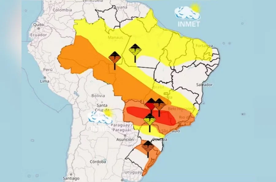 Os avisos para maior intensidade são válidos para a faixa que compreende grande porção de São Paulo, triângulo mineiro e região central de Mato Grosso do Sul.