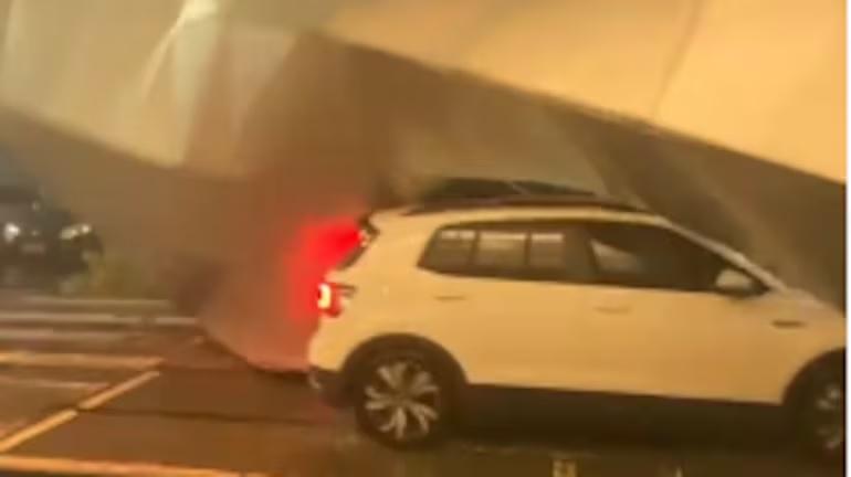Com rajadas de vento de até 87 km/h, parte da cobertura do estacionamento do shopping SP Market desabou, atingindo carros. Ninguém se feriu.