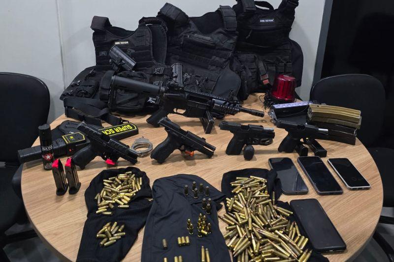 Foram apreendidas pistolas, um fuzil calibre 5.56, munições, algemas e um bote de alumínio com motor de 300 HP.