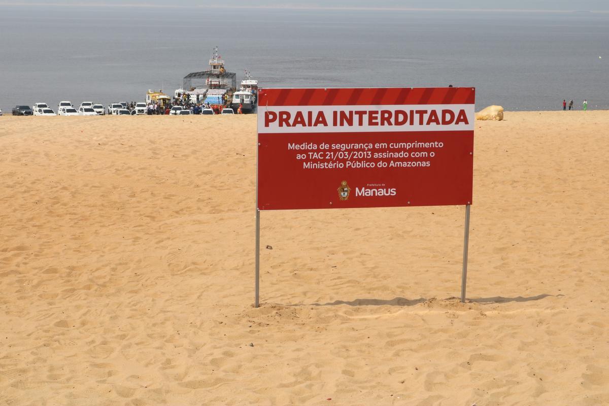 A Prefeitura de Manaus reforça a interdição da praia para o banho, em razão da extrema vazante que atinge o Estado, em 2023. A interdição está em vigor desde o dia 2 de outubro. No último dia 13 de outubro, a cota do rio Negro estava na marca de 13,91 metros, apenas 28 centímetros de bater o recorde de vazante registrado em 2010.