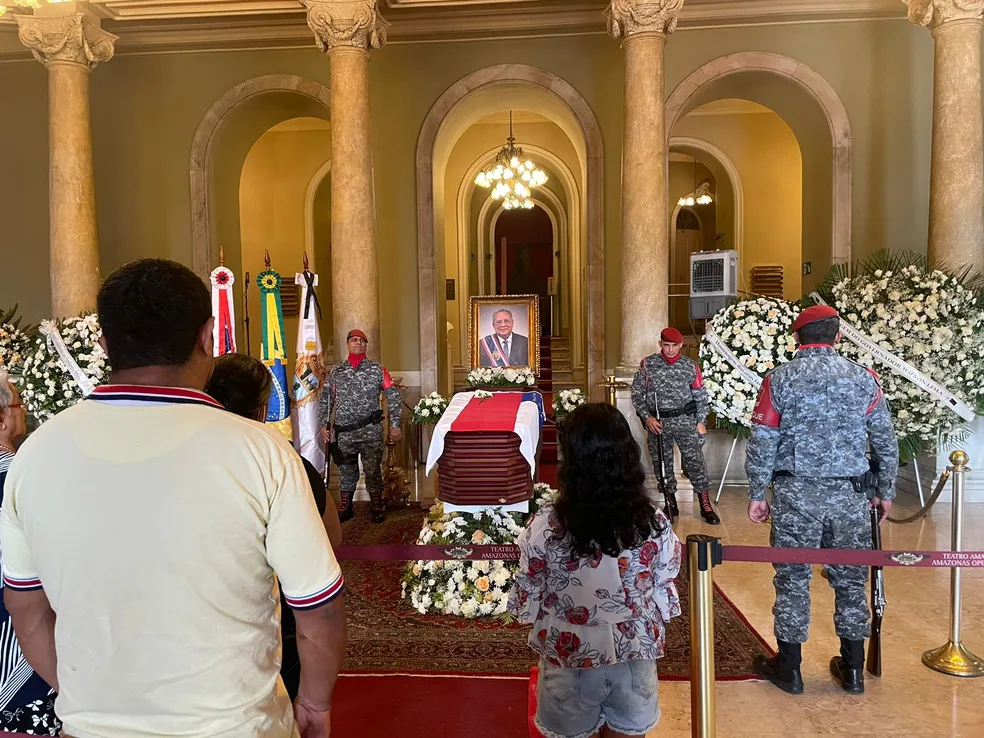 O velório do ex-governador Amazonino Mendes no Teatro Amazonas, Centro de Manaus, entrou no segundo dia nesta sexta-feira (17). Com o caixão fechado e coberto com a bandeira do estado, a cerimônia acontece no hall do Teatro Amazonas, no Centro de Manaus, até a manhã de sábado (18).