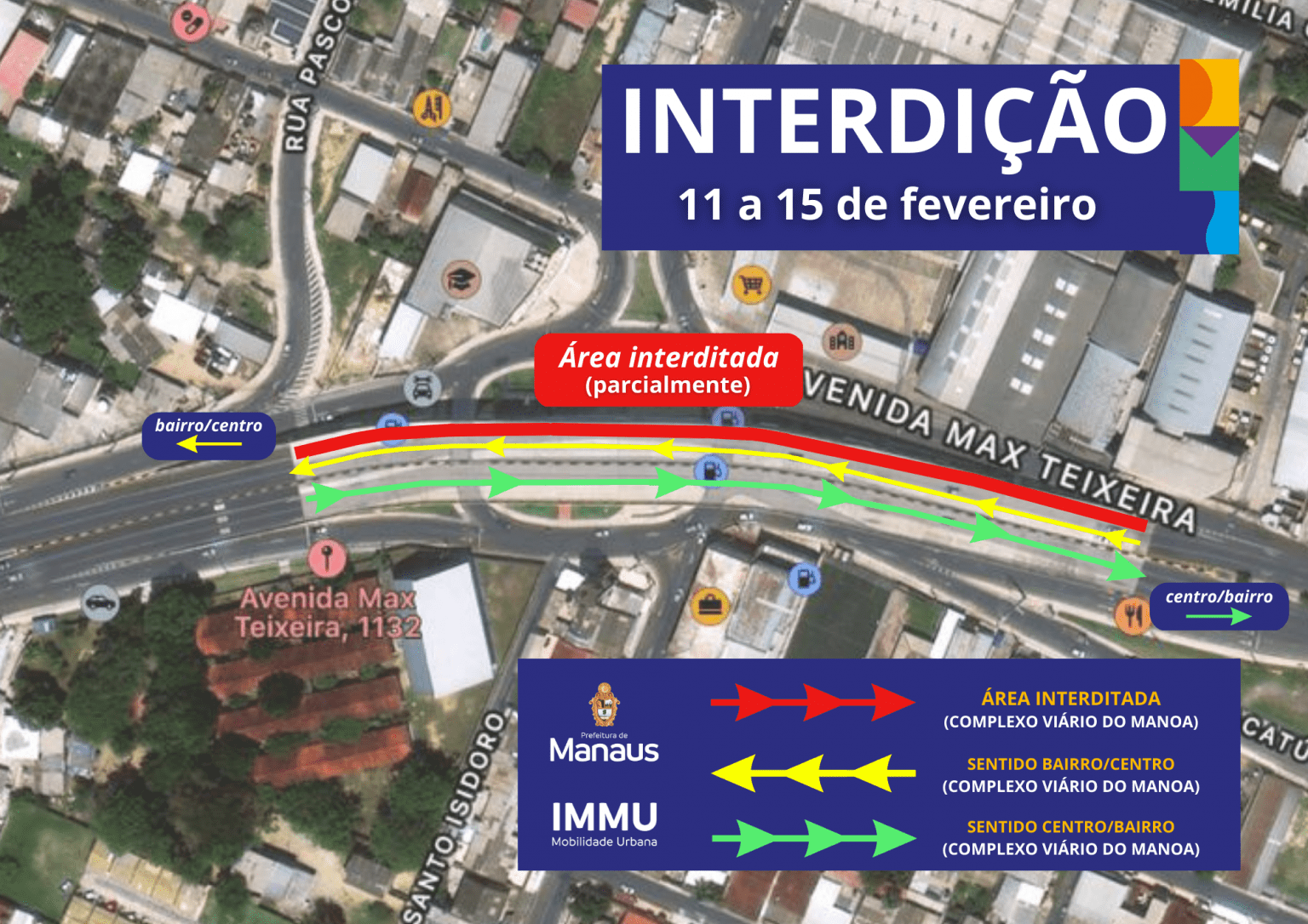 Prefeitura de Manaus por meio do Instituto Municipal de Mobilidade Urbana (IMMU), com o apoio da Secretaria Municipal de Obras (Seminf), irá interditar parcialmente, neste sábado no sentido bairro/Centro, uma pista da parte superior do viaduto do Manoa, localizado na avenida Max Teixeira, zona Norte, para que uma empresa particular realize a recuperação de buracos ocasionados no piso. A obra terá a duração de cinco dias e contará com o apoio dos agentes de trânsito para orientar os motoristas sobre os desvios.